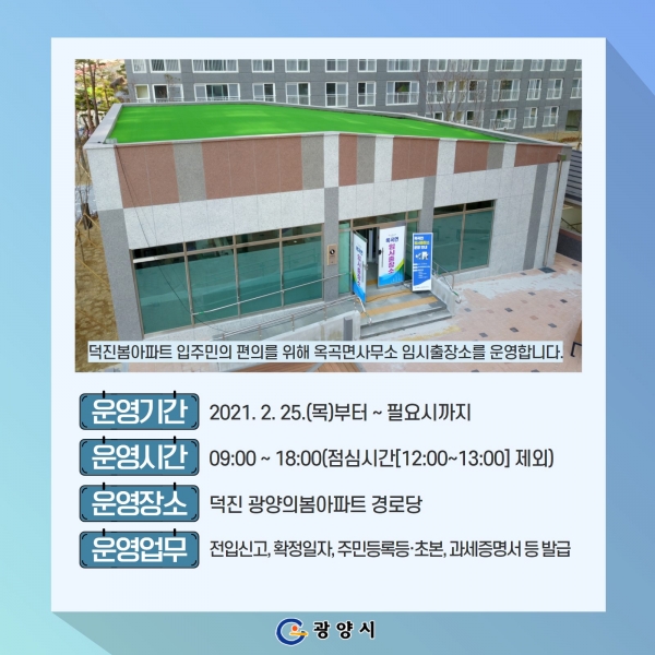 [한국Q뉴스] 광양시가 광영·의암지구 덕진봄아파트 입주민의 행정편의를 위해 입주예정일인 2월 25일부터 아파트 내 경로당에 임시출장소를 개소한다.