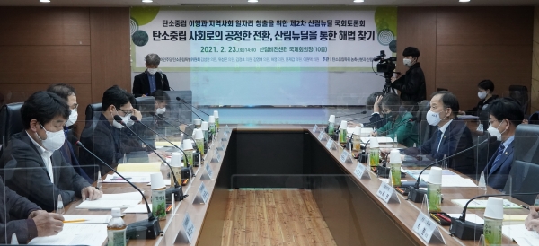 [한국Q뉴스] 산림청은 2월 23일 화요일 산림비전센터 국제회의장에서 2050 탄소중립 이행을 위한 산림자원 순환 필요성의 공감대를 형성하고 일자리 창출과 국민 참여방안 모색을 위해 ‘탄소중립 사회로의 공정한 전환, 산림뉴딜을 통한 해법찾기’ 국회토론회를 개최했다.