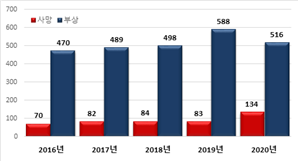 장소별 화재 건수는 주거시설 1만4,161건, 야외·도로 1만2,768건, 산업시설 7,749건 등의 순이었다.