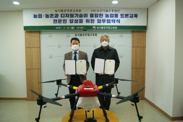2월 22일 농식품공무원교육원에서 열린 업무협약에는 김덕호 원장과 정형균 대표이사가 참석해 농업용 드론을 활용한 전문 인력을 체계적으로 양성하고 디지털 뉴딜 기반조성을 위해 상호 협력하기로 했다.