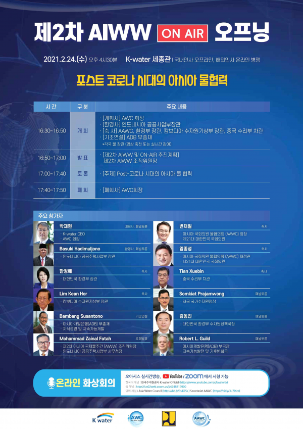 이번 온에어 개회식에는 국내 인사로 아시아국회의원물협의회 회장인 변재일 의원과 협의회 재정관인 임종성 의원, 아시아물위원회 회장인 박재현 한국수자원공사 사장, 김동진 환경부 수자원정책국장 등이 참가한다.