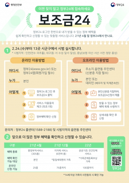 내가 받을 수 있는 국가보조금을 ‘정부24’에 접속해서 한 번에 확인할 수 있는 ‘보조금24’ 서비스가 대구광역시 5개 지자체 등 전국 13개 지자체 주민을 대상으로 시범 운영된다.