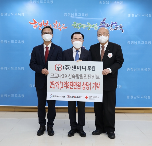 대한적십자사 충남지사 류창기 회장과 젠바디 김진수 대표는 “학생들이 학교에서 마스크를 벗는 날이 하루빨리 오길 기원하는 마음에서 이번 후원을 하게 됐다”며 “학교 내 코로나19 예방을 위해 유용하게 쓰이길 바란다”고 말했다김지철 교육감은 “기숙사 학생들을 대상으로 신속하고 선제적으로 진단검사를 시행해 학교 내 방역에 최선을 다하겠다”고 말했다.