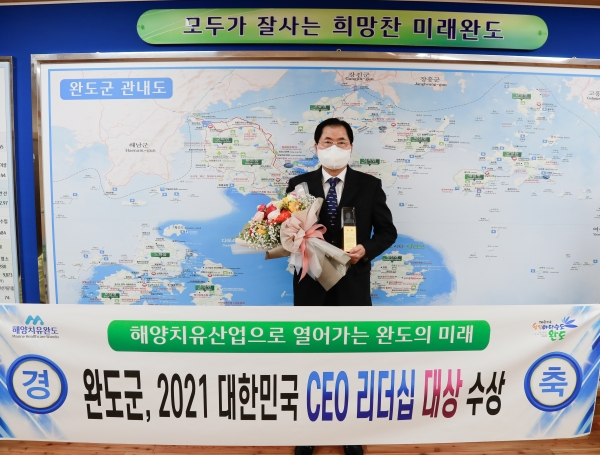 [한국Q뉴스] 신우철 완도군수가 지난 19일 서울 밀레니엄 힐튼호텔에서 열린‘2021 대한민국 CEO 리더십 대상’에서 혁신경영 부문 대상을 받았다.
