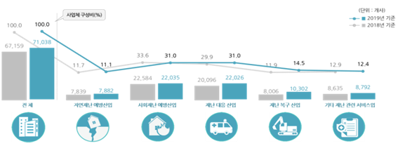 관련 사업체를 업종별로 살펴보면 사회재난 예방산업이 22,035개, 재난대응 산업이 22,026개로 전체 사업체의 62.0%를 차지했다.