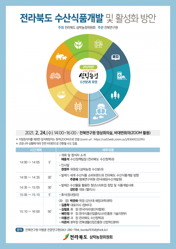 ‘전라북도 수산식품개발 및 활성화 방안’이라는 주제로 열린 이번 포럼은 전라북도 삼락농정위원회 수산분과가 주최하고 전북연구원 주관으로 전북연구원 영상회의실에서 화상회의 앱을 활용해 비대면 방식으로 진행했다.