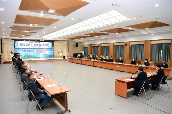 [한국Q뉴스] 김천시 이·통장 연합회는 지난 22일 김천시청 3층 강당에서 코로나19 예방을 위해 가림막 설치, 마스크 착용, 손 소독제 필수 사용 등 방역 수칙을 철저히 준수한 가운데 신년 총회를 개최했다.