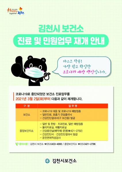 김천시는 지난 12월 16일부터 정부의 지침에 따라 보건소의 방역역량과 행정력을 코로나19 대응에 집중하고자 일반진료 및 호흡기 전담클리닉을 제외한 한방, 치과진료와 물리치료실, 건강증진실 운영 등 일부업무를 잠정 중단했으나 최근 코로나19 사태가 진정됨에 따라 시민들의 불편을 최소화 하고자 일부 업무를 조정해 중앙보건지소에서 운영 재개하기로 했다.