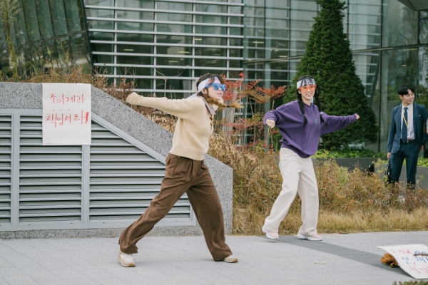 24일 ‘안녕? 나야’ 제작진은 극중 37살, 그리고 17살 반하니를 각각 연기하는 최강희, 이레 두 사람이 조아제과 사옥 앞에서 댄스 시위를 벌이는 모습을 담은 스틸컷을 공개했다.