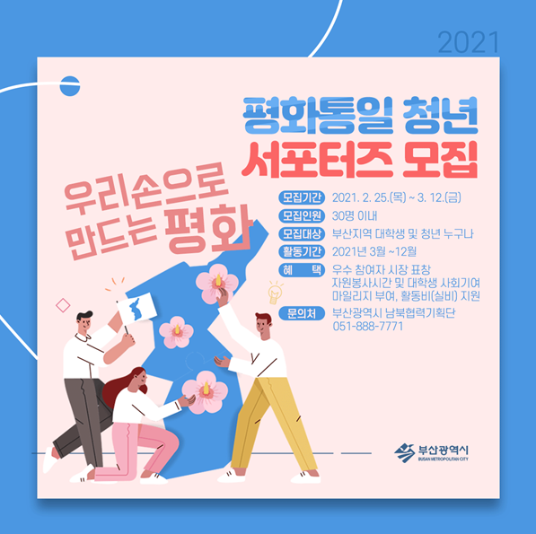 [한국Q뉴스] 부산시는 평화·통일에 대한 시민들의 관심 유도 및 공감대 확산을 위해 활동할‘평화통일 청년 서포터즈’를 3월 12일까지 모집한다고 밝혔다.