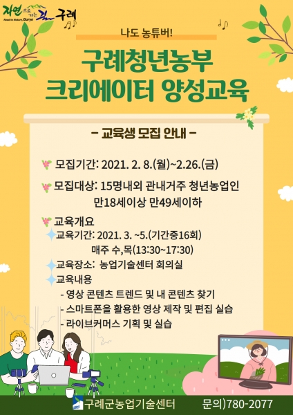 군은 구례청년농부 크리에이터 양성교육 교육생을 2월 8일부터 26일까지 관내에 주소를 둔 만 18세이상부터 만49세이하로 스마트폰 활용이 능숙한 청년농업인 대상으로 모집한다.