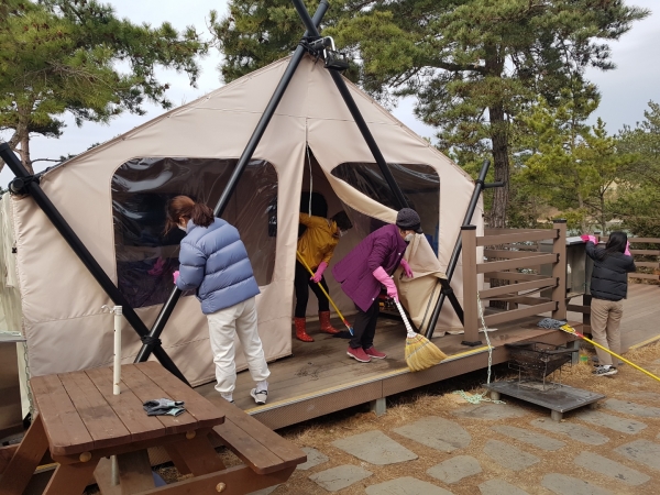또한, 공동 편의시설인 개수대와 화장실 등 대청소를 비롯해 글램핑 텐트 12동과 단체글램핑 텐트 3동 내·외부의 오염물질을 세척하며 깨끗한 환경 관리에 철저를 기했다.