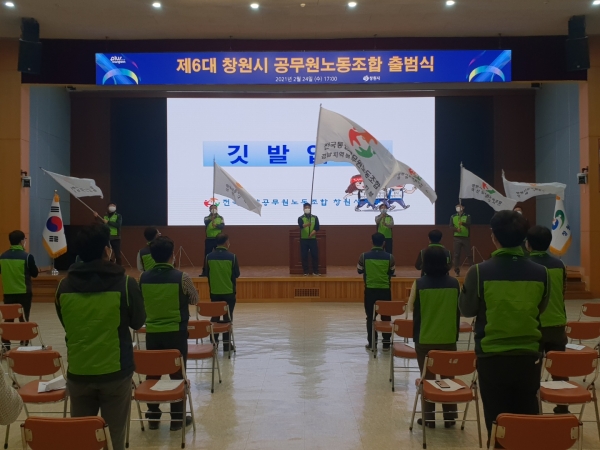 이날 출범식은 코로나19를 감안해 노조 운영위원 34명만이 참석해 진행했으며 지부별 깃발입장, 위원장의 출범사로 시작했으며 허성무 창원시장을 비롯한 이치우 창원시의회 의장, 전국통합공무원노동조합 안성은 위원장은 미리 촬영된 영상을 통해 축하메세지를 전달했다.