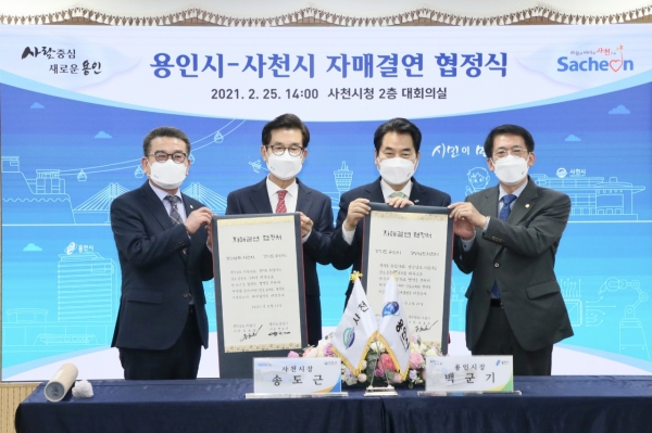 [한국Q뉴스] 경남 사천시와 경기도 용인시가 25일 사천시청 대회의실에서 상생 발전과 공동 번영을 위한 자매결연 협약을 체결했다.