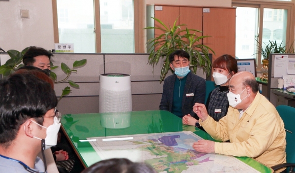 이날 정 시장은 바쁜 일정 속에서도 직접 간식을 들고 투자일자리과를 찾아가 직원들을 격려하고 대화하는 자리를 가졌다.
