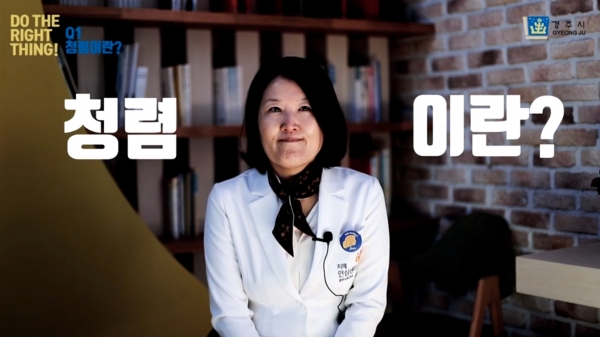 이번 영상에 출연한 경주시 보건소 정신건강팀 박정희 주무관은 “더 좋은 세상을 만드는 것이 공무원 존재의 이유인 동시에 청렴의 이유이다”고 밝혔다.