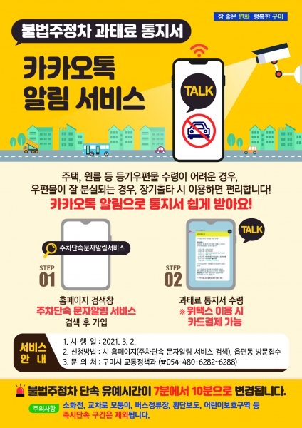 [한국Q뉴스] 구미시는 3월 2일부터 효율적인 주정차 단속체계 개편을 위해 불법주정차 과태료 통지서 카카오톡 알림 서비스 시행 및 불법주정차 단속 유예시간을 7분에서 10분으로 변경한다.