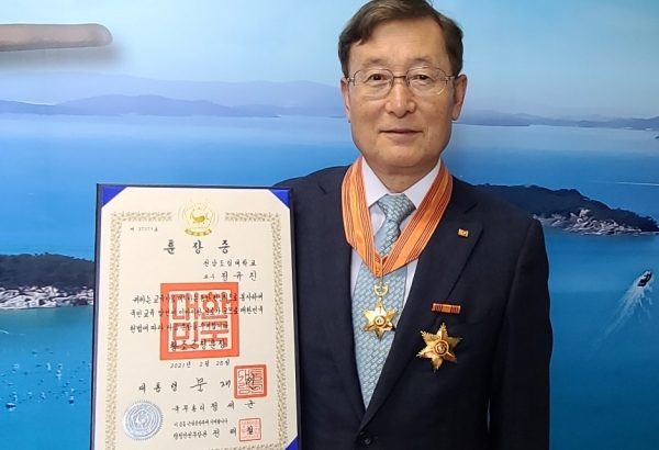 [한국Q뉴스] 정규진 해양바이오연구센터장이 지난달 26일 전남도립대학교에서 수산가공 및 식품산업 분야에서의 탁월한 연구 활동과 헌신적인 교육 활동으로 국가와 대학 발전에 기여한 공로를 인정받아 영예의 ‘황조근정훈장’을 행정안전부로부터 전수받았다.