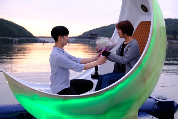 문보트는 IoT 기술이 접목된 초승달 모양의 전동 레저 보트로 선체에 LED 조명이 탑재돼 있고 조이스틱을 통해 전후좌우, 360도 회전 등 누구나 쉽게 조종이 가능하다.
