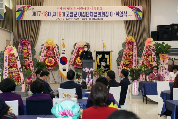 [한국Q뉴스] 고창군 여성단체협의회가 지난 3일 고창군 르네상스웨딩홀에서 회원과 관련 기관단체장 등이 참석한 가운데 제17·18대, 제19대 회장 이취임식을 열었다.