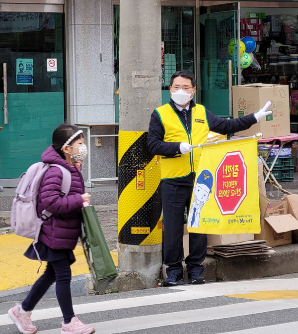 보행 신호를 기다리는 학부모와 학생에게 인사를 건네며 소통하는 시간도 가졌다.