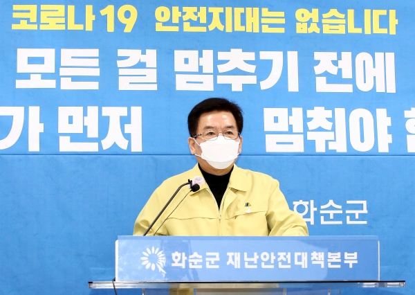 구충곤 화순군수는 발표문을 통해 “백신 접종에 따른 기대감으로 코로나19 확산에 대한 경계심이 풀리는 순간, 언제든지 대유행이 다시 시작될 수 있다”고 우려하며 “언제 어디서나 반드시 마스크를 착용하고 5인 이상 사적 모임 금지 등 방역 지침을 철저하게 준수해 달라”고 당부했다.