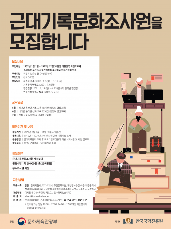 [한국Q뉴스] 문화체육관광부는 한국국학진흥원과 함께 3월 8일부터 19일까지 ‘근대기록문화 조사원’ 500명을 모집한다.