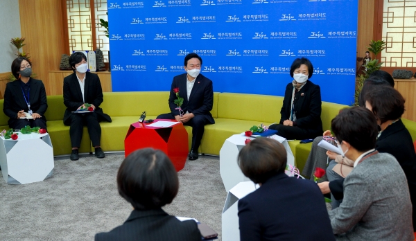 원희룡 지사는 이날 오전 9시 제주도청 소통회의실에서 4급 이상 관리직 여성 공무원 15명이 한 자리에 모인 자리에서 이같이 밝혔다.