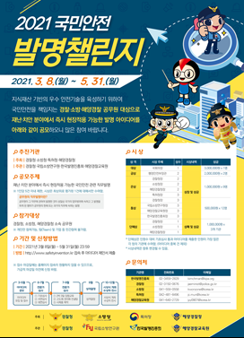 [한국Q뉴스] 경찰청은 특허청, 소방청, 해양경찰청과 공동으로 “제4회 ‘2021 국민안전 발명챌린지’” 아이디어 공모전을 실시한다고 밝혔다.