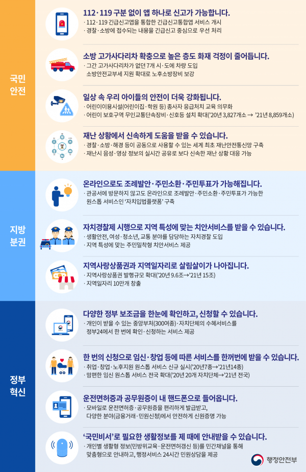 행정안전부는 “국민 모두가 안전하고 골고루 잘사는 나라”라는 비전을 설정하고 국민을 위한 경찰개혁 완수, 코로나19 조기 극복과 재난안전관리체계 혁신, 자치분권 2.0 추진과 지역활력 회복, 디지털 전환을 선도하는 정부혁신을 중점 추진한다고 밝혔다.