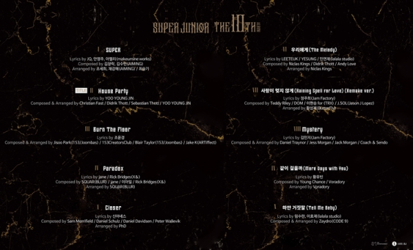 그중 1번 트랙인 ‘SUPER’는 파워풀한 베이스 사운드와 트렌디한 신스 사운드에 슈퍼주니어만의 에너지가 더해진 곡으로 강렬한 존재감을 나타낸다.
