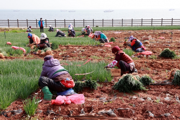 [한국Q뉴스] 경칩이 지나 포근한 들녘에서 농민들이 보성쪽파 수확에 분주히 손을 움직이고 있다.