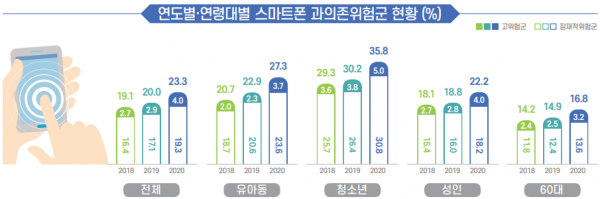 연령대별로 살펴보면, 유아동의 과의존위험군 비율은 4.4%p 증가한 27.3%로 나타났고 청소년은 35.8%, 성인은 22.2%, 60대는 16.8%로 조사됐다.