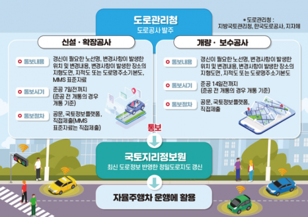 도로공사의 유형 중 신설·확장 공사는 자율주행자동차법 시행규칙 제 12조 각 호와 정밀도로지도의 기반자료를, 개량·확장 공사는 국토교통부령 제 12조 각 호에 해당하는 사항을 국토지리정보원에 통보하도록 명시했다.