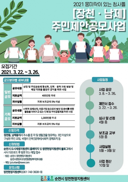 공모지역은 역세권 지역, 장천·남제동 지역, 저전동 3~4통 지역으로 주민공동체 활성화 등 일반공모에는 최대 400만원, 사회적경제조직·마을기업 육성 등 기획공모에는 최대 1000만원이 지원된다.