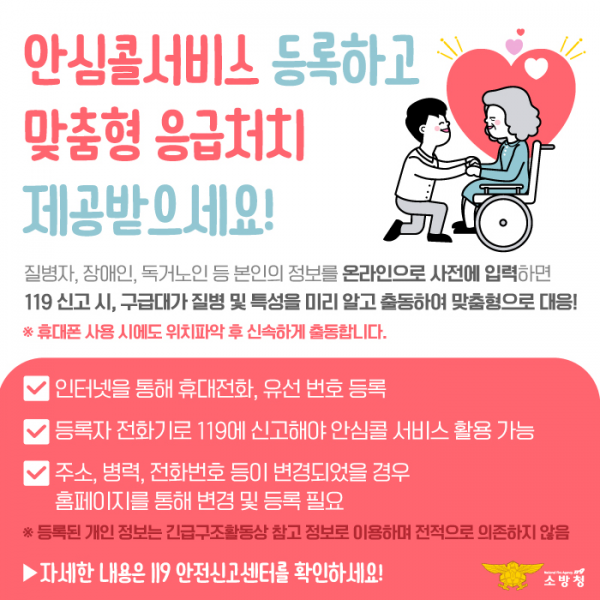 [한국Q뉴스] 소방청은 독거노인, 중증장애인 등 취약계층의 응급상황 발생 시 보다 신속한 대응을 위해 보건복지부 응급안전안심서비스 가입자에게도 119안심콜서비스를 제공한다고 밝혔다.