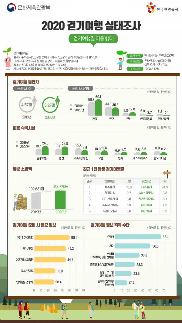 걷기여행 실태조사는 국민들의 걷기여행 트렌드와 이용 행태 분석을 위해 2018년부터 매년 실시 중인 것으로 조사 기간은 2020년 12월 11일부터 24일까지이며 만 15세 이상 전 국민 2천 명을 대상으로 온라인과 전화조사로 진행했다.