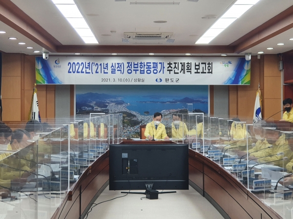 [한국Q뉴스] 완도군은 지난 10일 군청 상황실에서 봉진문 부군수 주재로 지표관리 부서장 18명이 참석한 가운데 2022년 정부합동평가 대비 추진 계획 보고회를 개최했다.