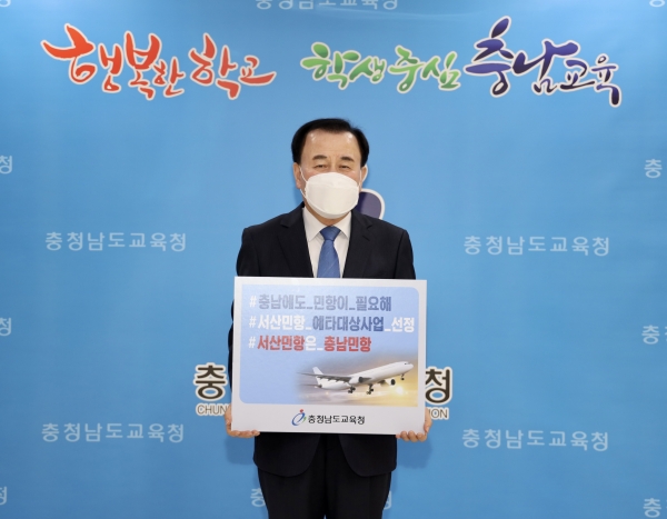 김교육감은 ‘충남에도_민항이_필요해, 서산민항_예타 대상사업_선정, 서산민항은_충남민항’이라는 표어가 적힌 팻말을 들고 지역균형발전 실천 의지를 표현했다.