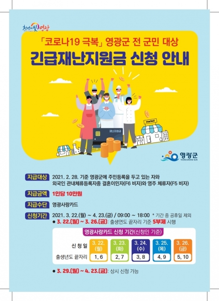 신청은 3월 22일부터 4월 23일까지로 ‘영광사랑카드’를 보유중인 세대주는 관청 방문 없이 영광군청 홈페이지를 통해 온라인 신청이 가능하지만 보유하지 않은 세대주는 주소지 읍면사무소 방문을 통해 가능하며 신청 첫째주는 출생연도 끝자리 5부제 시행으로 일시에 많은 신청자들이 읍면사무소에 방문하는 것을 방지할 계획이라고 전했다.