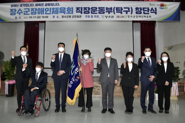 [한국Q뉴스] 장수군장애인체육회는 12일 장수군청에서 장영수 군수, 김용문 장수군의회 의장, 권성안 장수군장애인체육회 부회장 및 협약기관 가맹단체장과 임원, 장애인탁구계 인사 등 40여명이 참가한 가운데 창단식을 가졌다.
