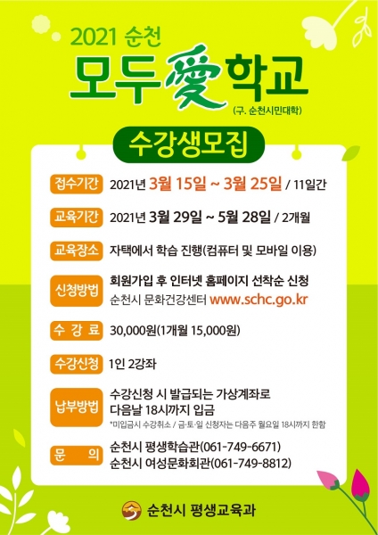 [한국Q뉴스] 순천시는 2021년 1학기 모두愛학교 온라인 프로그램 교육에 참여할 수강생을 오는 3월 15일부터 25일까지 11일간 모집한다.