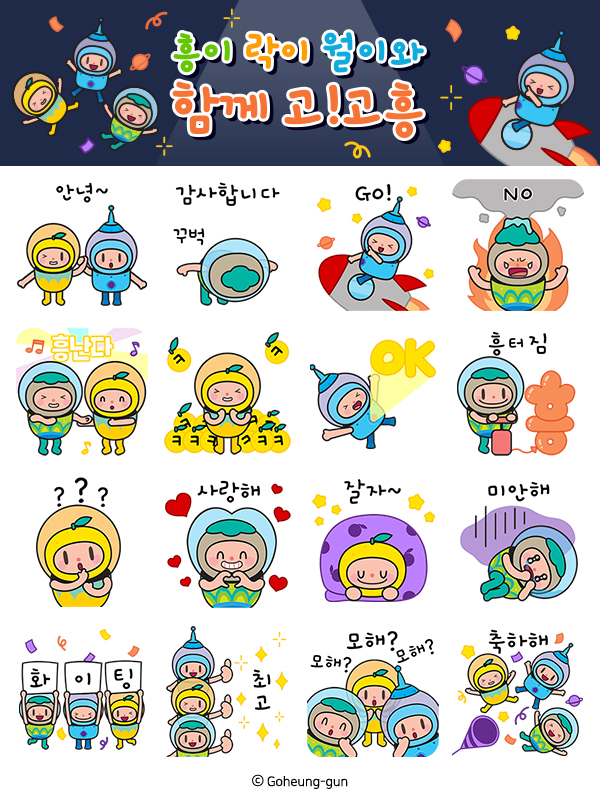이번에 배포되는 이모티콘은 총 16종으로 고흥군 캐릭터인 흥이·락이·월이를 활용해 카카오톡 대화시 자주 사용하는 표현들로 구성했다.