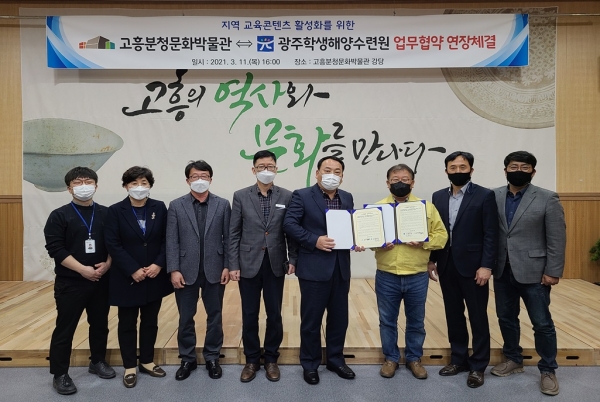 [한국Q뉴스] 고흥군은 지난 11일 고흥분청문화박물관 2층 강당에서 고흥분청문화박물관과 광주학생해양수련원이 ‘지역 교육콘텐츠 활성화를 위한 교육 업무협약’을 연장하는 체결식을 가졌다.