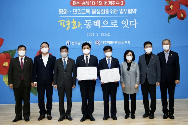 전남교육청과 제주교육청은 지난 12일 오후 여수교육지원청 대회의실에서 업무협약을 맺고 평화·인권교육 활성화를 위해 상호협력하기로 합의한 데 이어 유성수 교육위원장 등 전남도의원들이 지원과 협력을 약속하고 나섰다.