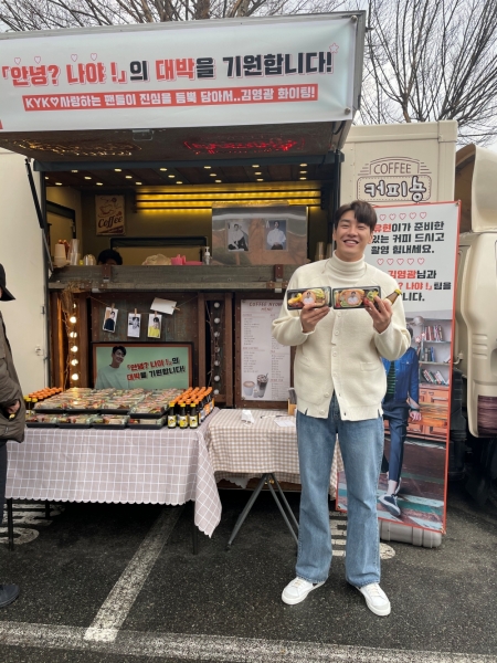 [한국Q뉴스] 20201년 최고 대세 배우 김영광이 드라마 ‘안녕? 나야’ 촬영으로 바쁜 나날을 보내는 중 배우 진기주와 국내팬, 여러나라의 해외팬들로부터 받은 커피차에 ‘찐행복’을 느끼며 세상 다 가진 표정을 짓고 있어 이목이 집중되고 있다.