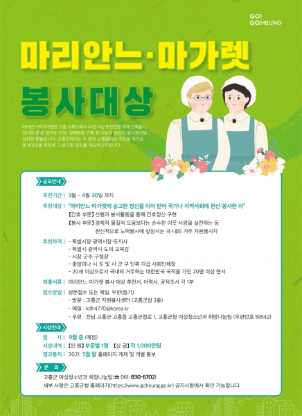 [한국Q뉴스] 고흥군은 마리안느와 마가렛 두 분 간호사의 노벨 평화상 추천을 계기로 ‘마리안느·마가렛 봉사대상’을 제정하고 오는 4월 30일 까지 후보자를 추천 공모한다.
