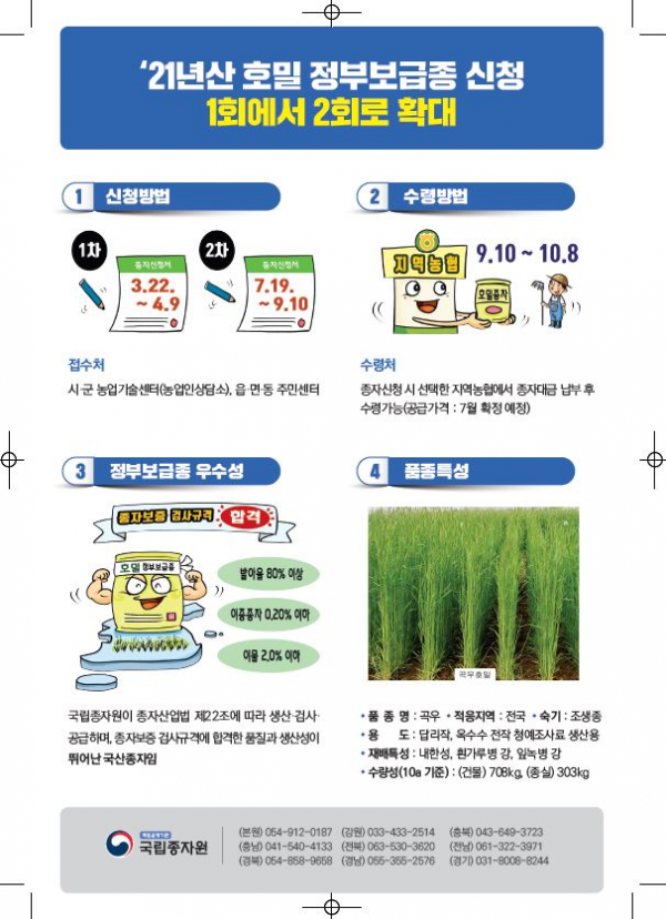 공급하는 호밀 종자는 지정된 신청기간에 시·군 농업기술센터, 읍·면·동 주민센터에 선착순으로 신청 접수하고 지역농협에서 수령 할 수 있다.