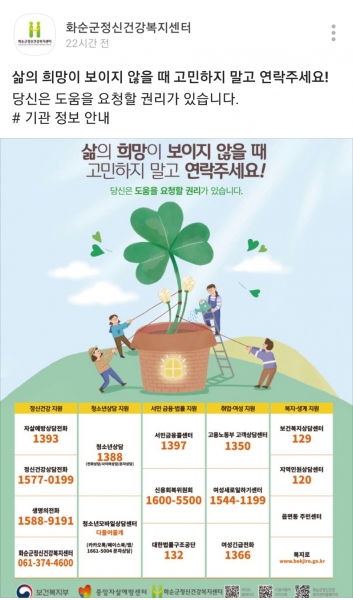 [한국Q뉴스] 화순군이 코로나19 장기화로 우울감을 호소하는 군민들을 위해 전화와 카카오톡 채널을 통해 비대면 상담 서비스를 운영한다.