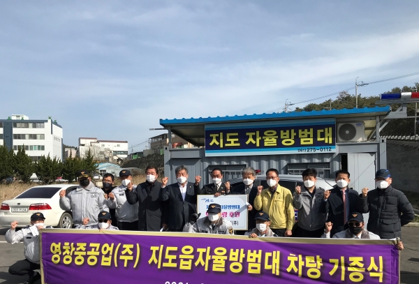 차량을 기증한 영창중공업 주식회사는 강교 사업을 통한 축적된 기술로 플랜트와 조선사업으로 사업영역을 확장하고 있고 지도읍에는 신안공장을 운영하고 있는 내실 있는 기업으로 박길식 대표는 “사회공헌 측면을 고심하던 중 활발하게 활동하고 있는 지도 자율방범대가 떠올랐다”며 “방범·순찰 등 자원봉사 활동시 사용 할 차량을 기증할 수 있게 되어 기쁘게 생각한다”고 말했다.
